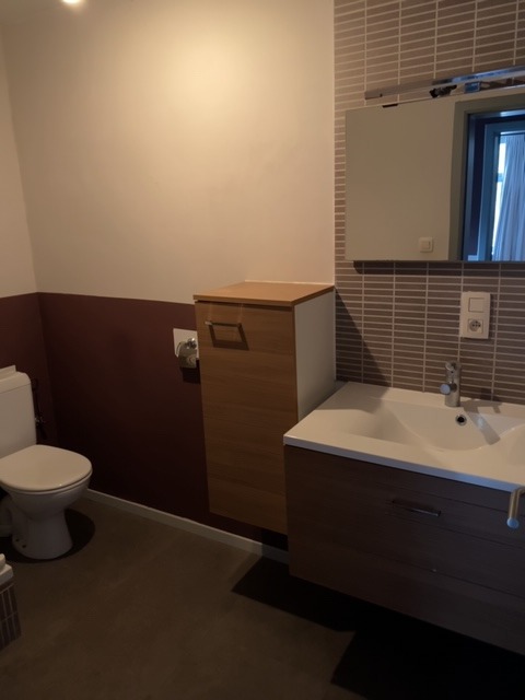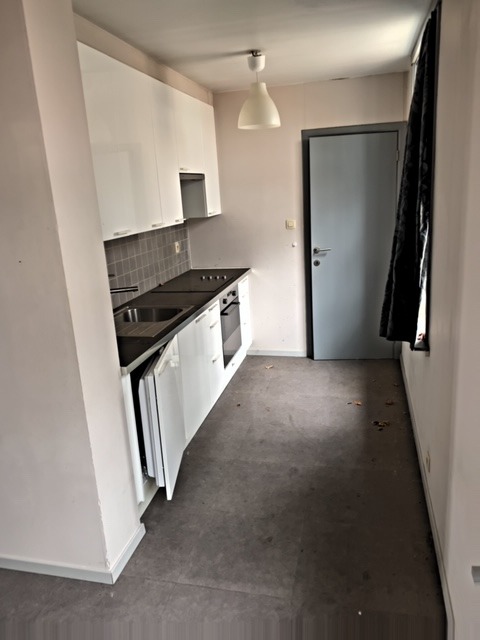 Inkomhal, badkamer met toilet, lavabo-meubel en douchecabine, ingerichte keuken, living en 1 slaapkamer.