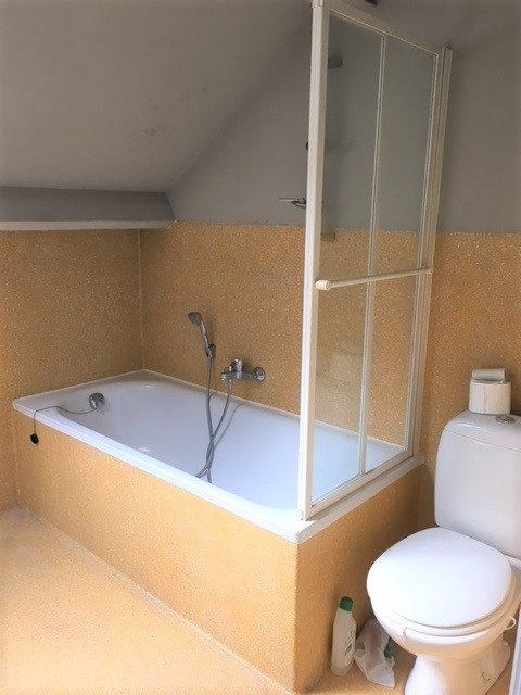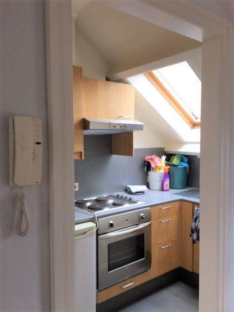 Lichtrijke living, ingerichte keuken (koelkast, kookvuur, dampkap, oven en dubbele spoelbak), berging met aansluiting voor wasmachine, 1 slaapkamer en badkamer met bad/douchescherm, lavabomeubel en toilet. Vestiairekast naast de inkomdeur boven, fietsenstalling mogelijk in de naastgelegen garage (geen verder gebruik van de garage)
