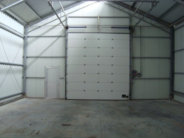 Grote poort ( 4-4 M ) met toegangsdeur, geïsoleerd dak. Gepolierde beton. Veel lichtinval, stopcontacten. Enkel stockage mogelijk, geen handel!