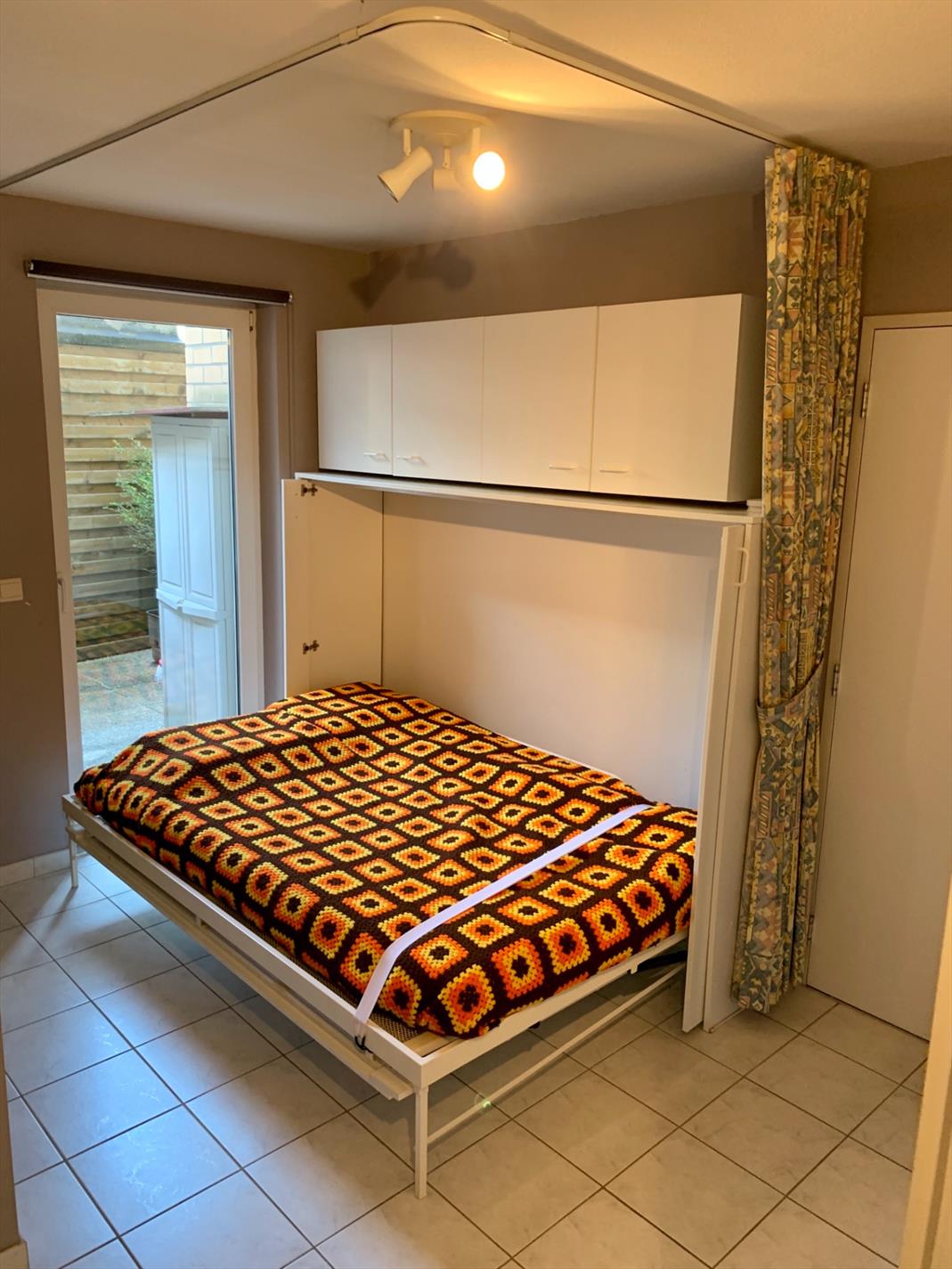 Inkomhal, apart toilet, ruime slpk met veel inbouwkasten, badkamer met bad-douche combinatie, slaaphoek met functioneel inklapbedmeubel, aparte bergruimte.
