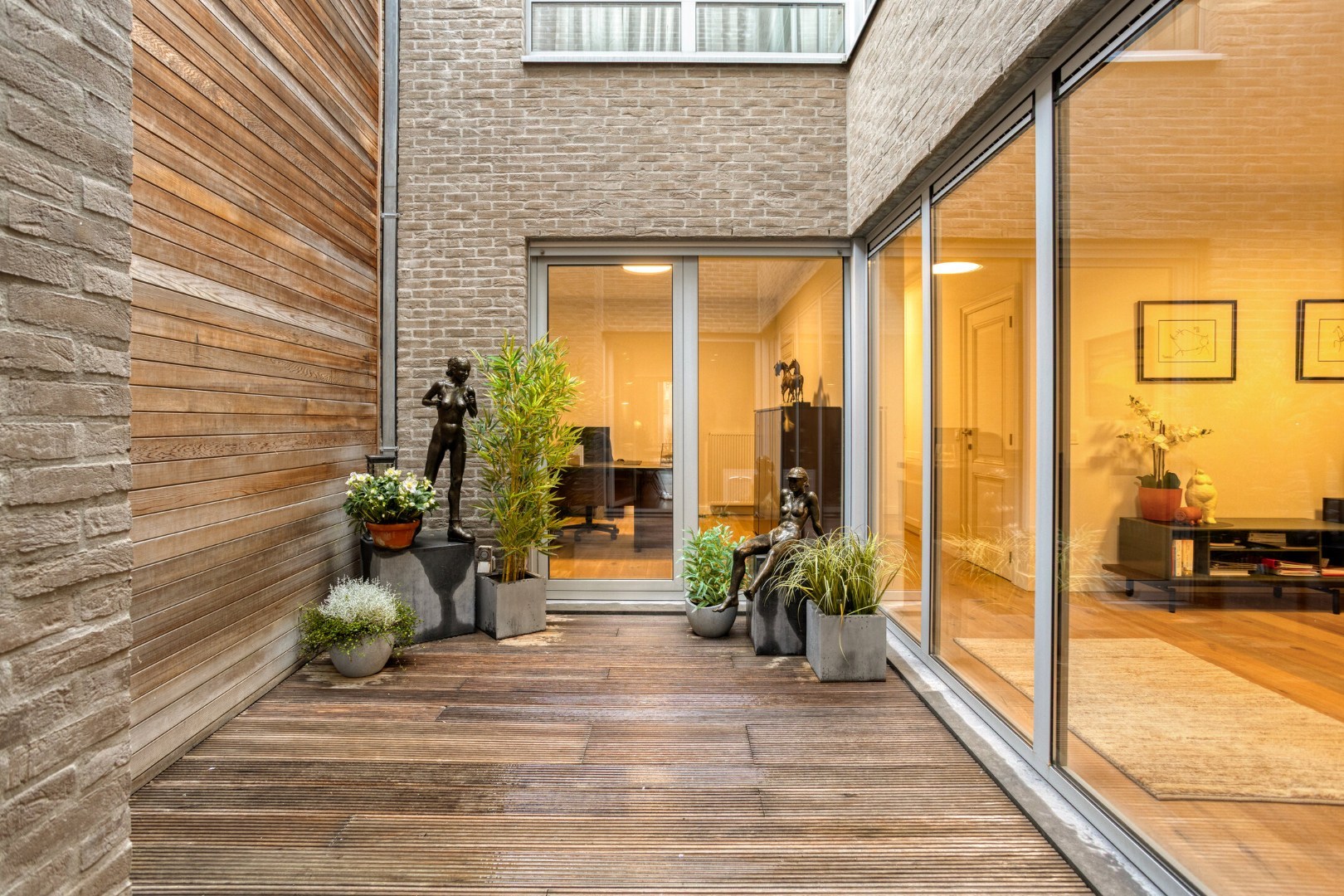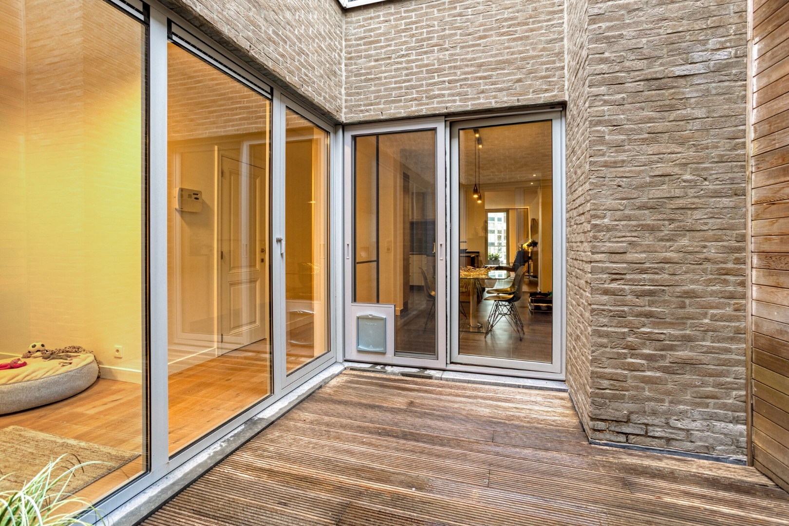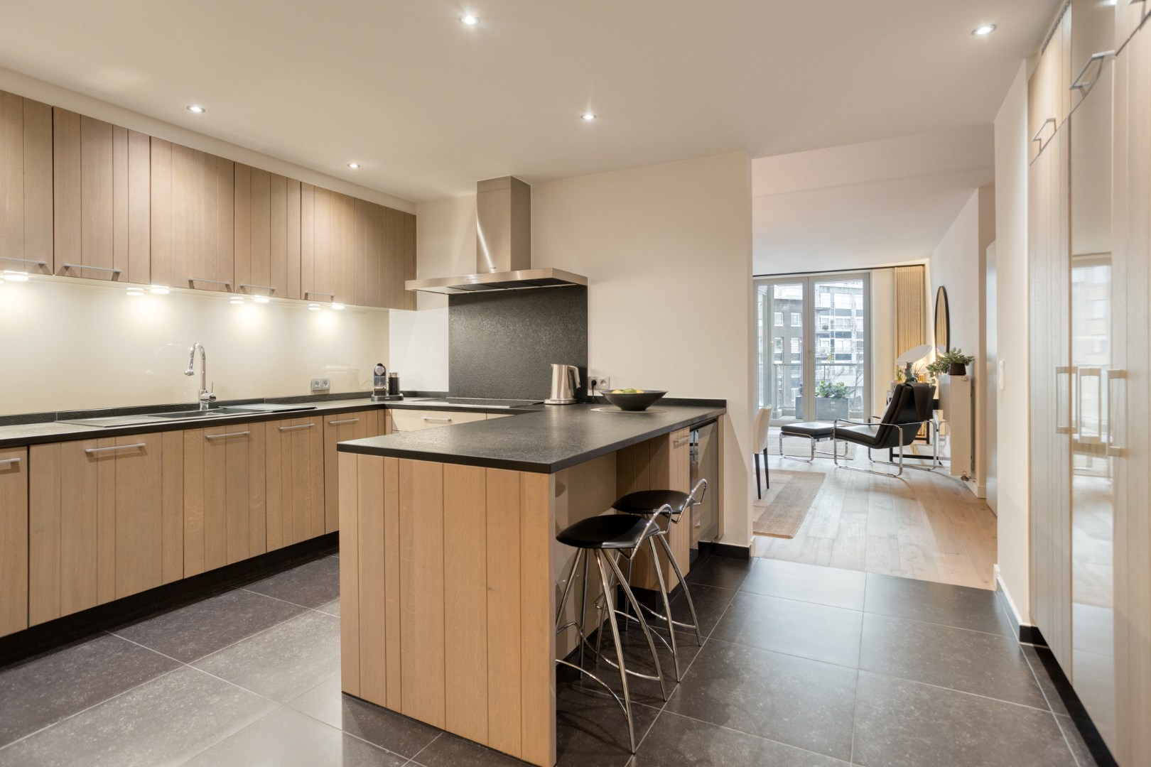 Inkomhal, apart toilet, vestiaire. Ruime living in eiken parket met gezellig terras, beiden geven open zicht op de Grote Markt en het Heymanplein. Aparte ingerichte design leefkeuken met Miele toestellen omvattend ijskast, diepvries, kookplaat, oven-combi-stoomoven, vinotheek ea. Aanpalende gezellige patio.