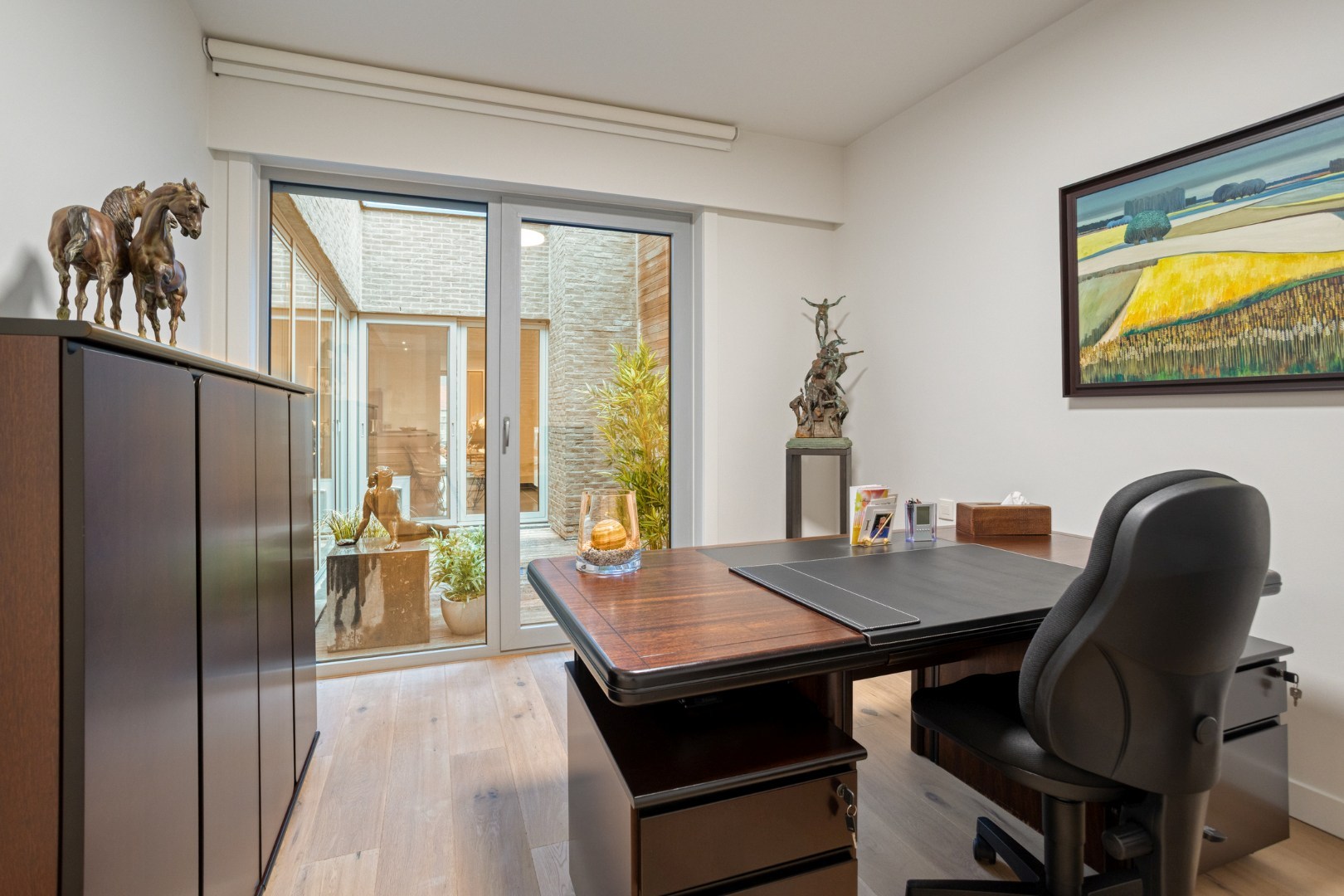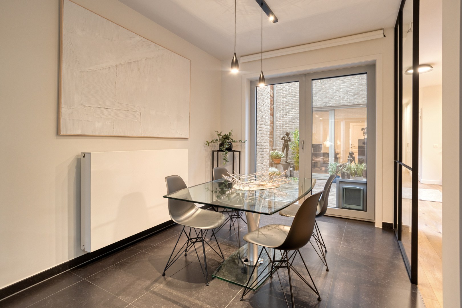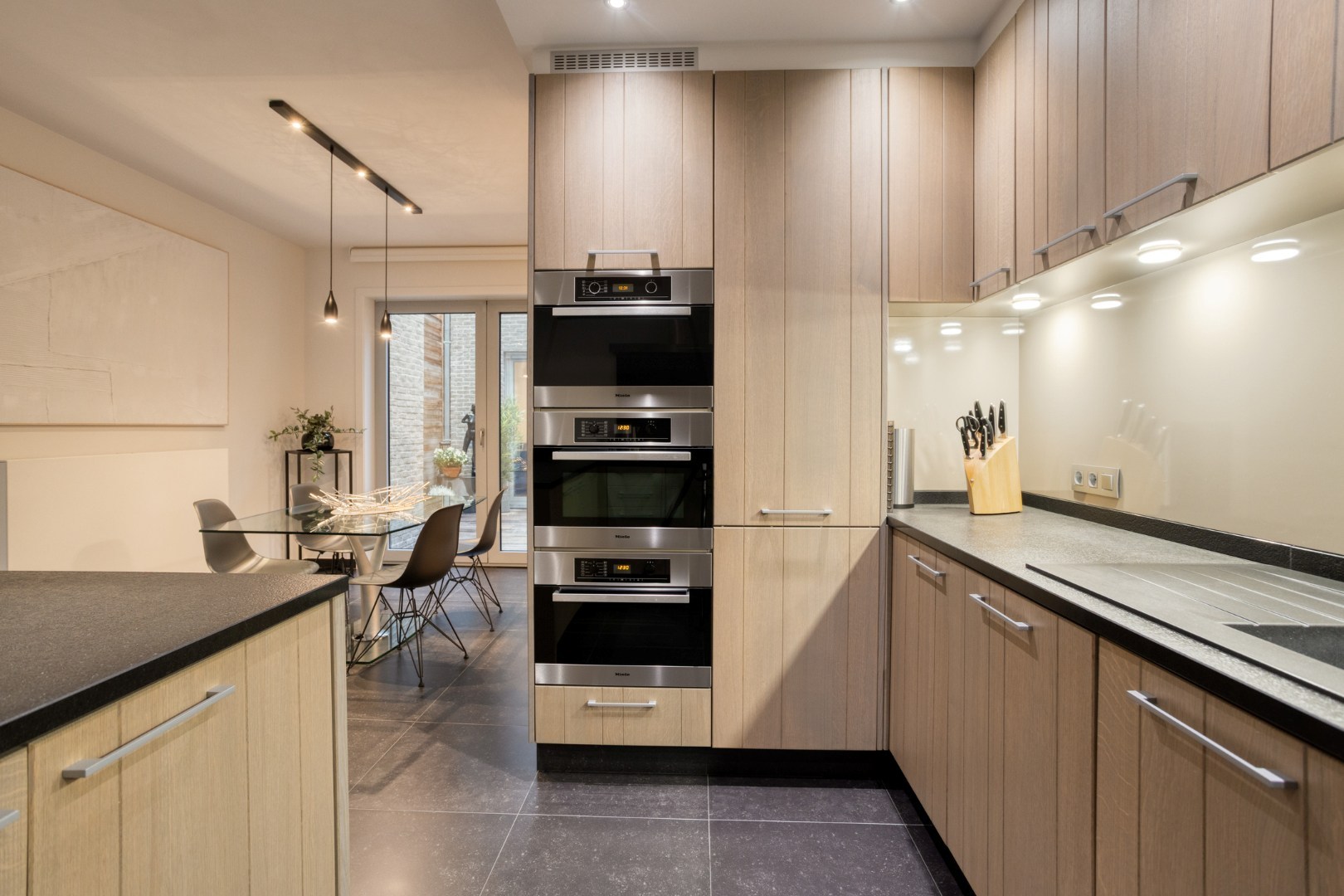 Inkomhal, apart toilet, vestiaire. Ruime living in eiken parket met gezellig terras, beiden geven open zicht op de Grote Markt en het Heymanplein. Aparte ingerichte design leefkeuken met Miele toestellen omvattend ijskast, diepvries, kookplaat, oven-combi-stoomoven, vinotheek ea. Aanpalende gezellige patio.