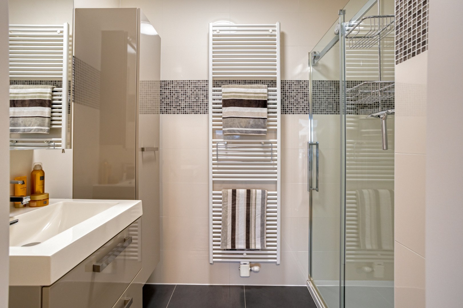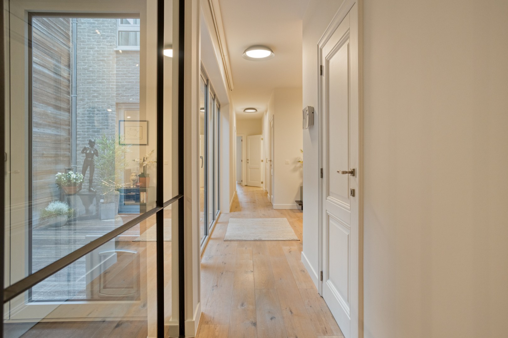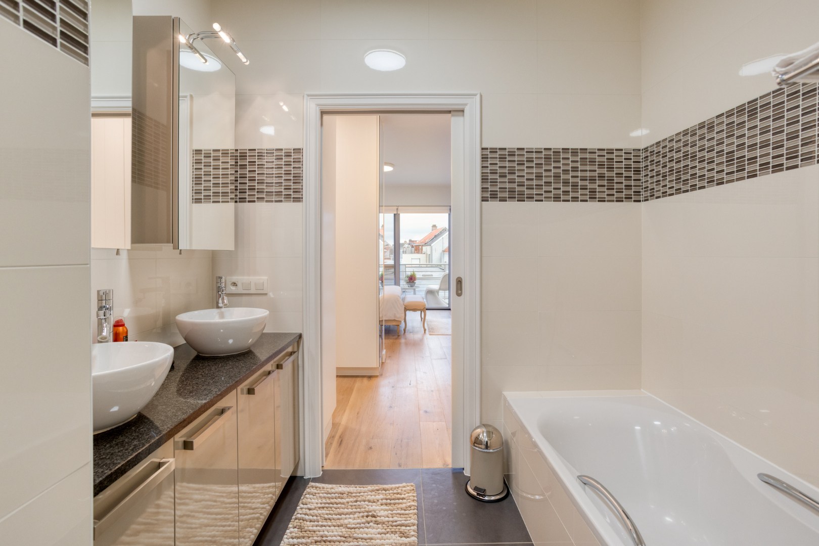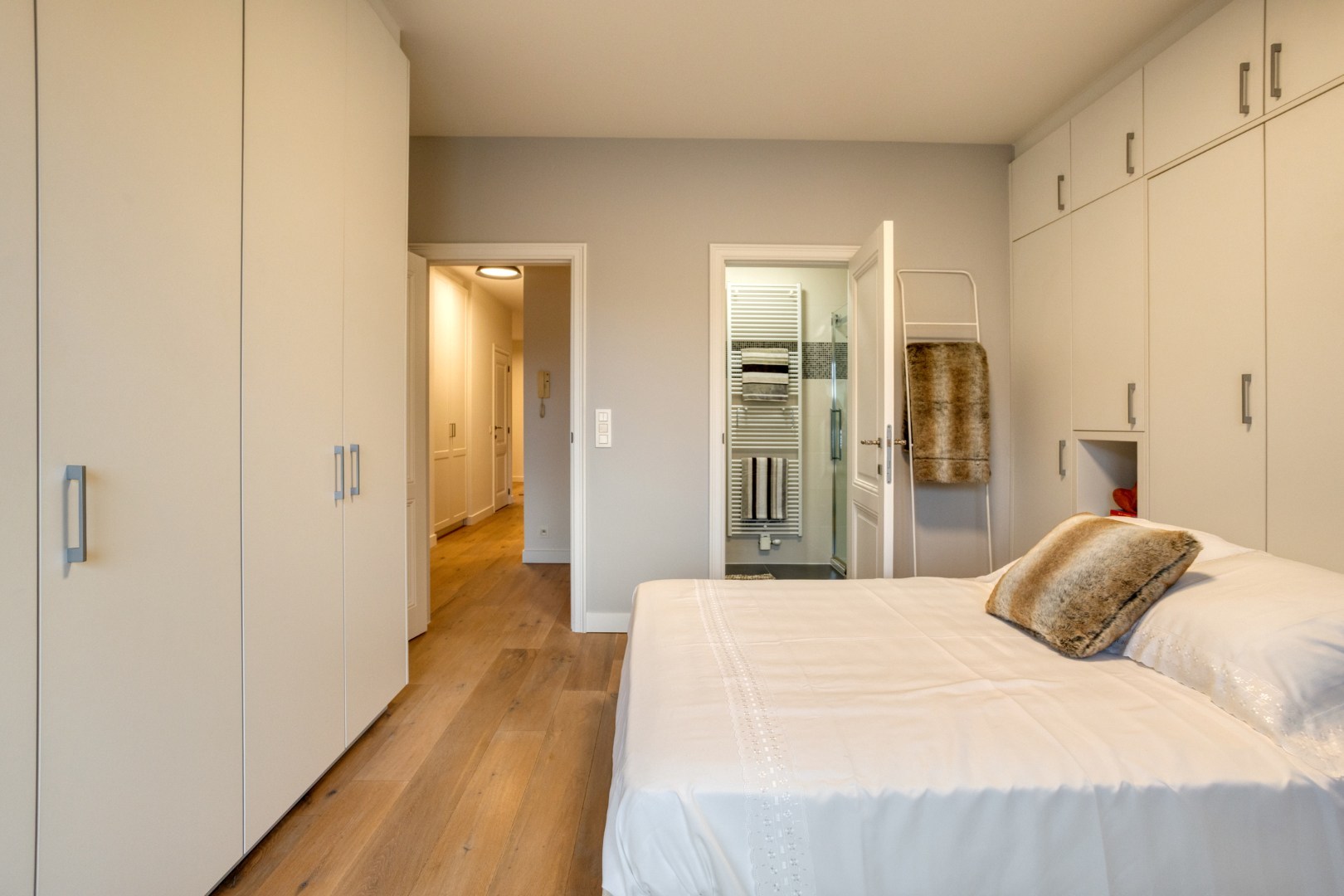 3 slaapkamers waarvan masterbedroom volledig voorzien van dressing en badkamer met ligbad, douche, toilet en dubbel lavabo-meubel. 2de slaapkamer heeft eigen badkamer met douche en lavabomeubel. Gepantserde kogelvrije inkomdeur, beveiligde toegang.