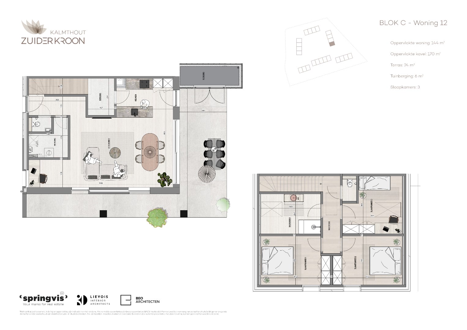 Zuiderkroon omvat 24 eengezinswoningen met elk drie slaapkamers en één verdieping, verdeeld over zes charmante woonpaviljoenen. BLOK C, woning 0.12 ; 3 slpks. Terras circa 24 m². Privatieve tuinberging.€ 475.000 exl btw en registratie