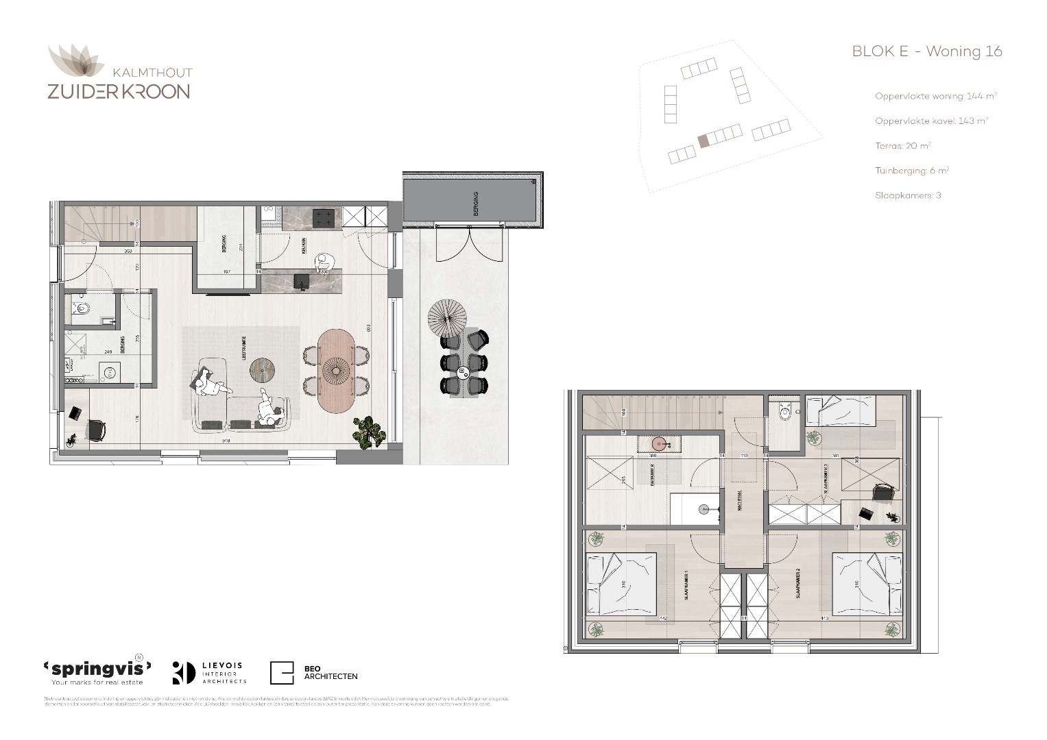 Zuiderkroon omvat 24 eengezinswoningen met elk drie slaapkamers en 1 verdieping, verdeeld over zes charmante woonpaviljoenen. BLOK D, woning 0.16 ; 3 slpks. Terras circa 20 m². Privatieve tuinberging.€ 467.000 exl btw en registratie