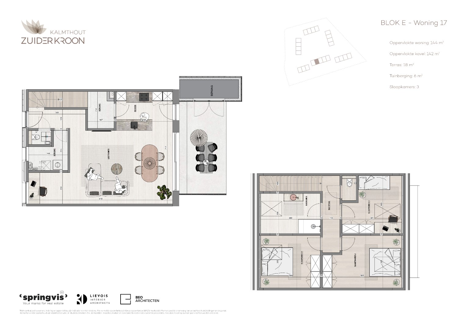 Zuiderkroon omvat 24 eengezinswoningen met elk drie slaapkamers en 1 verdieping, verdeeld over zes charmante woonpaviljoenen. BLOK E, woning 0.17 ; 3 slpks. Terras circa 18 m². Privatieve tuinberging. € 457.000 exl btw en registratie