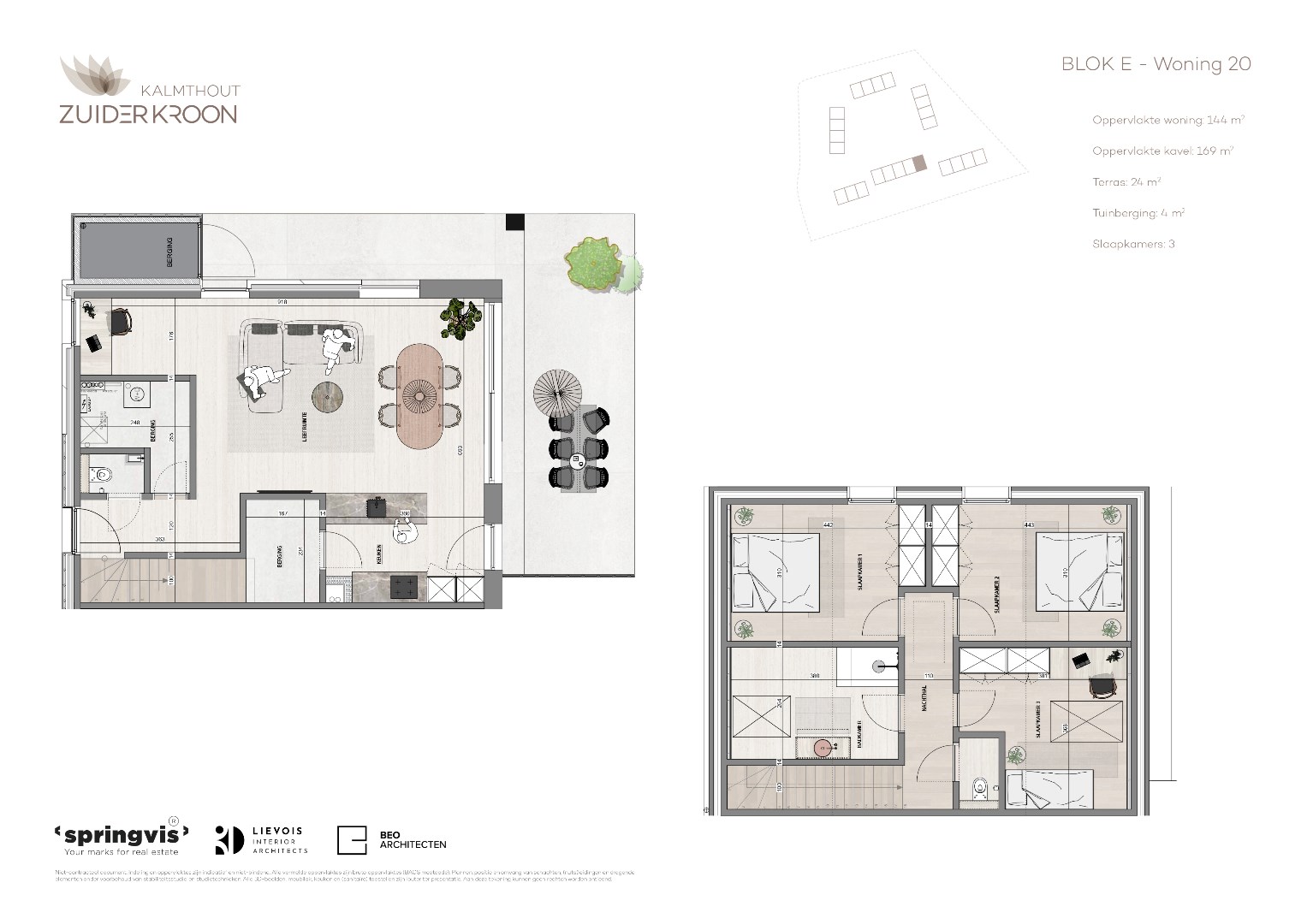 Zuiderkroon omvat 24 eengezinswoningen met elk drie slaapkamers en 1 verdieping, verdeeld over zes charmante woonpaviljoenen. BLOK E, woning 0.20; 3 slpks. Terras circa 24 m². Privatieve tuinberging. € 467.000 exl btw en registratie