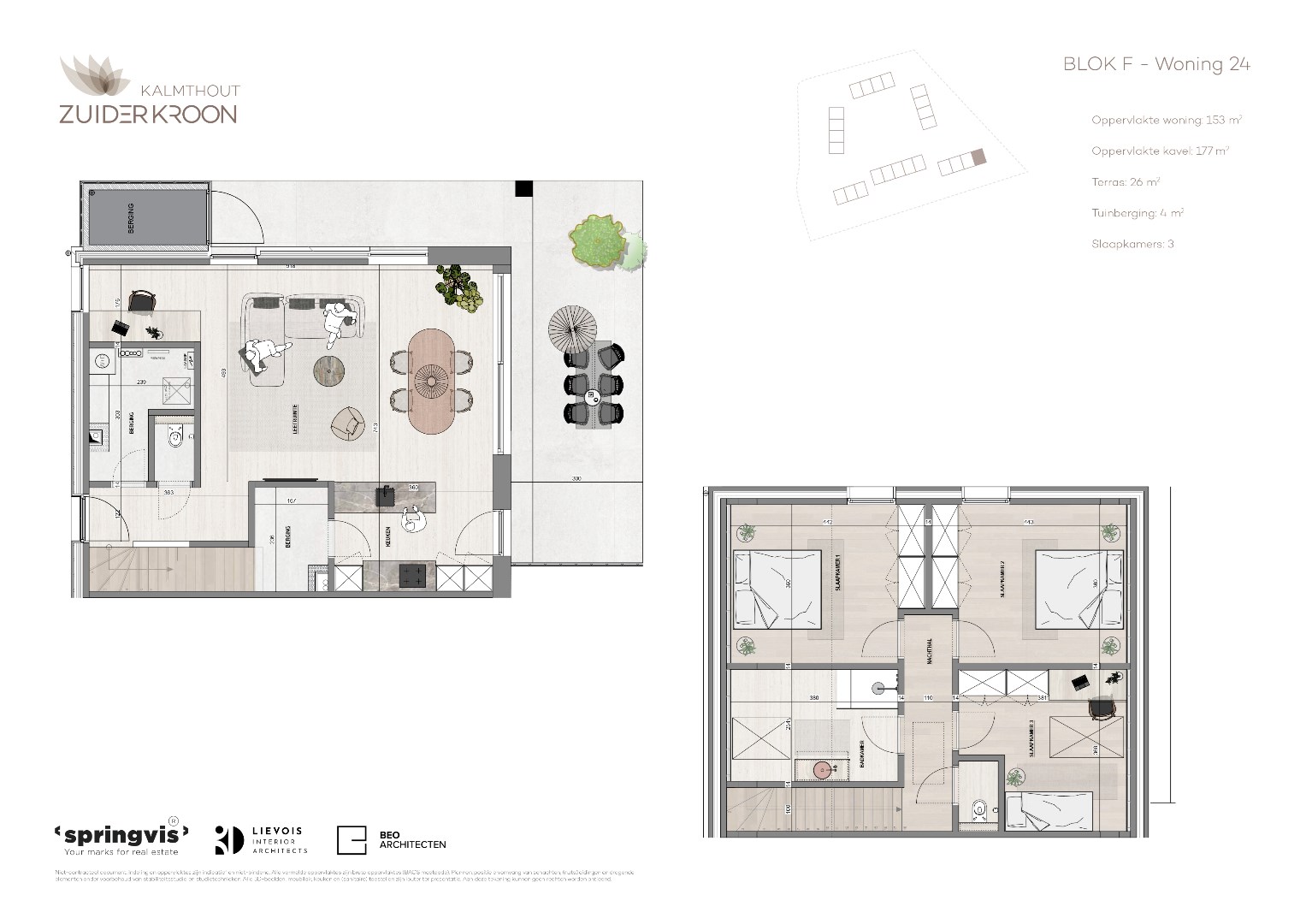 Zuiderkroon omvat 24 eengezinswoningen met elk drie slaapkamers en 1 verdieping, verdeeld over zes charmante woonpaviljoenen. BLOK F, woning 0.24; 3 slpks. Terras circa 26 m². Privatieve tuinberging. € 478.000 exl btw en registratie