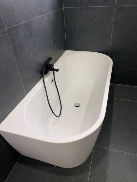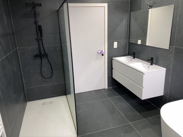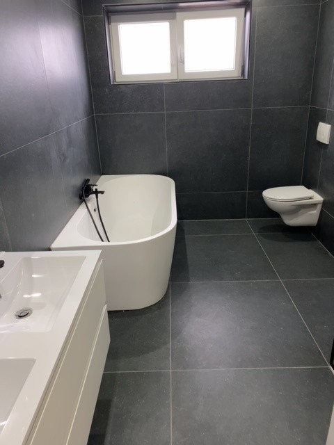 3 ruime slpks en badkamer met ligbad-inloopdouche-toilet-lavabomeubel. Oprit voor 2 wagens, terras en tuin.
