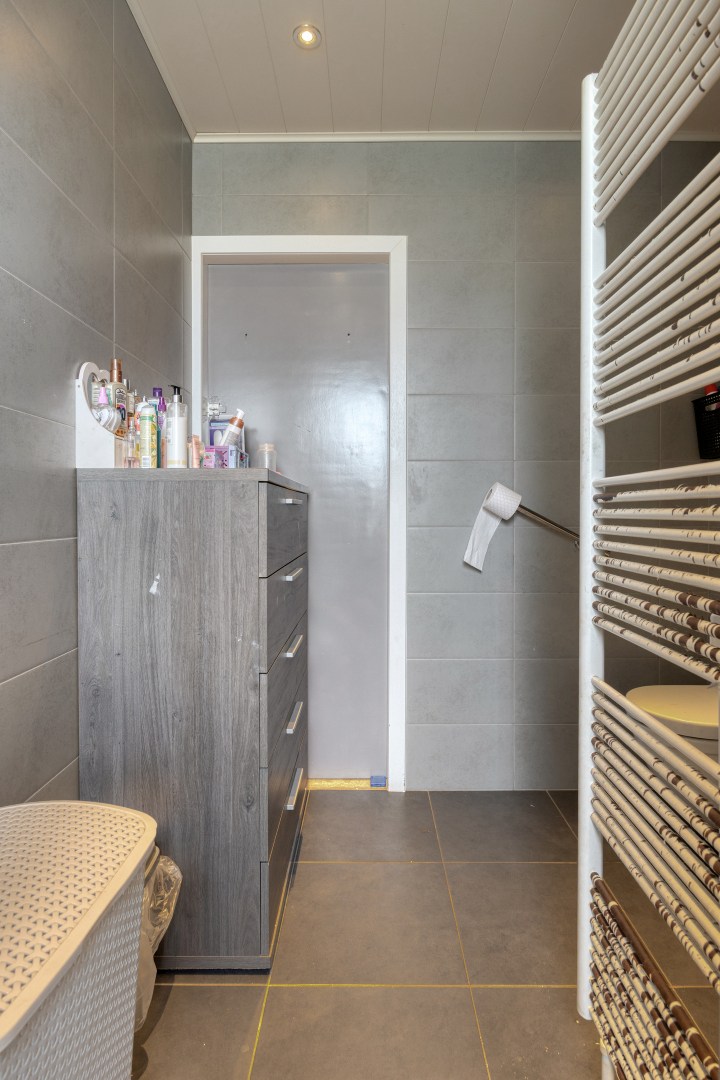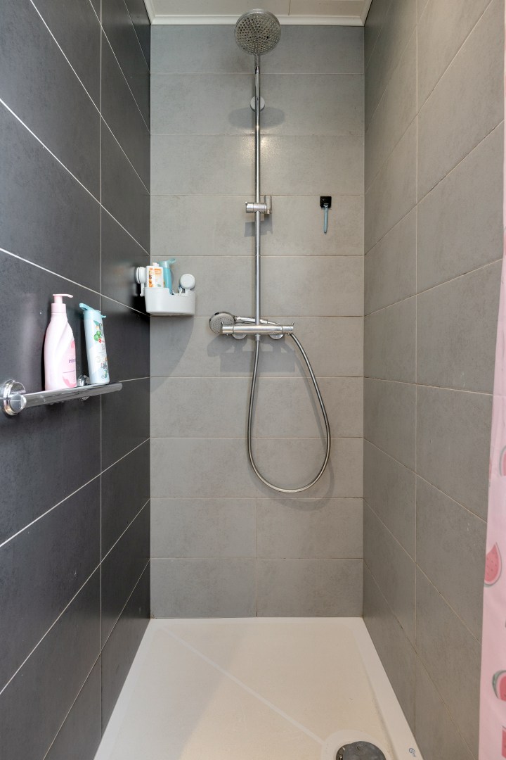 Inkomhal, ruime living, badkamer beneden met toilet, douche en lavabomeubel.