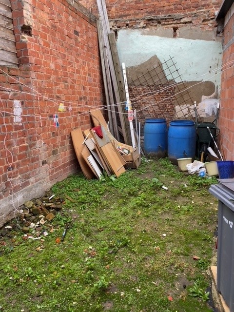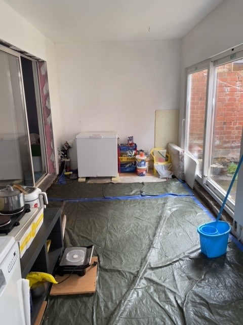 Verder af te werken renovatiewoning met 4 slpks, tuin en kleine garage-fietsenberging.