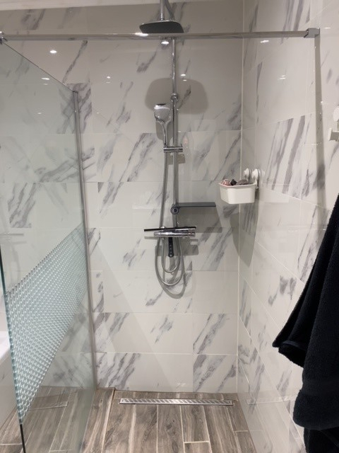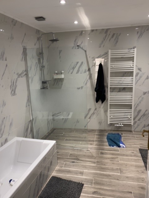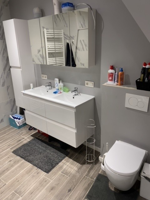 Badkamer met dubbel lavabomeubel, ligbad, inloopdouche. 3 slaapkamers op 1 ste verdieping, apart toilet.