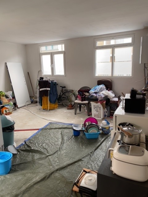 Inkomhal, living, woonkeuken ( wel verder af te werken en te voorzien van toestellen en vloeren ), tuin, kleine garage/fietsenberging.