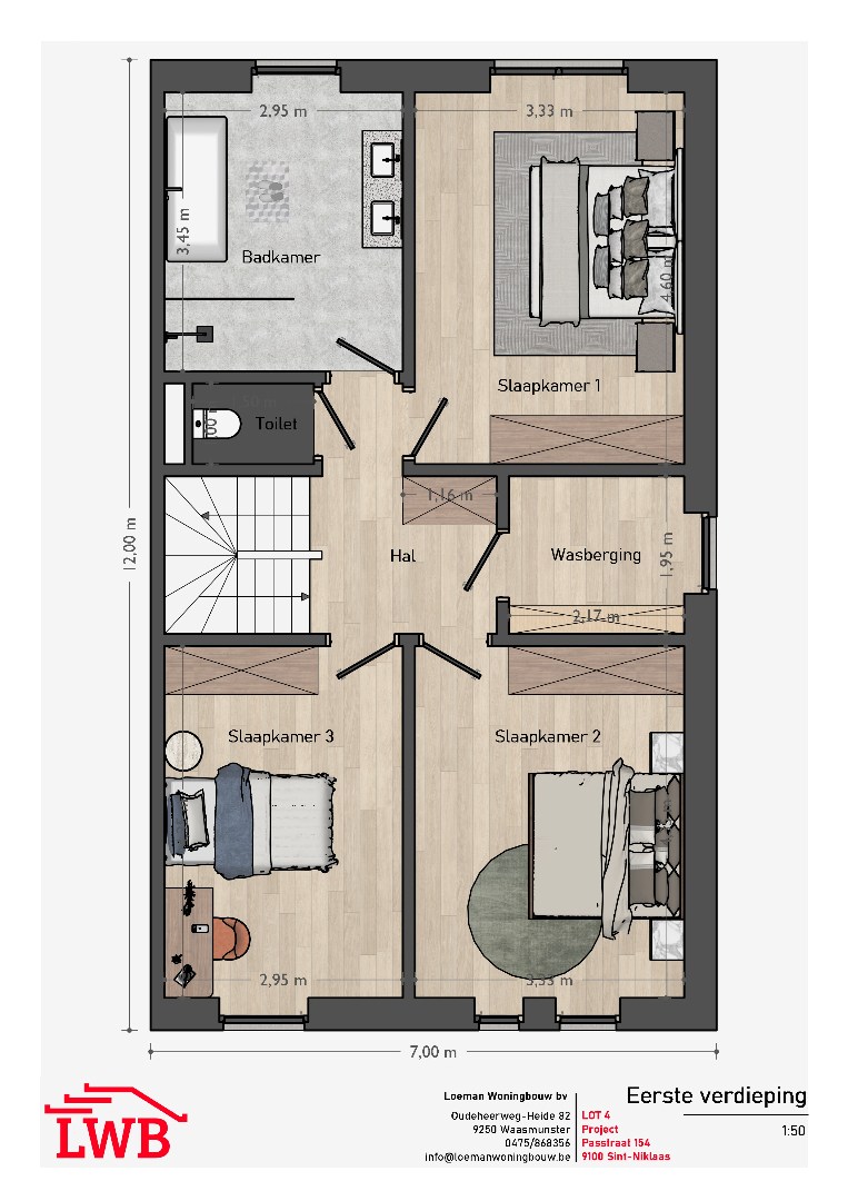 Op de 1ste verdieping hebben we 3 slaapkamers en badkamer. De 2e verdieping is optioneel volledig verder af te werken naar eigen keuze ( extra slaapkamers, bureel... ).